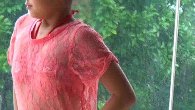 次のシーンでは、可愛らしい上品な雰囲気の赤チェックのミニスカートを脱いで、スクール水着姿でキャッチボール。