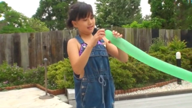 ラストでは、紫紐ビキニ&サロペット姿で風船遊び。